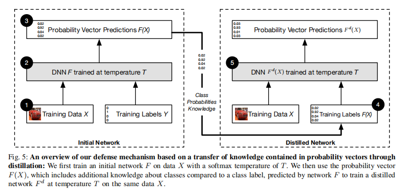 MOTIVATION: 此前大多数工作都是从正则化方法或数据增强角度防御对抗攻击。本文分析了将蒸馏用作对抗样本的防御机制("概率向量"的蕴含的丰富信息),利用蒸馏过程中提取的“知识”来降低被攻击者利用来生成对抗样本的网络梯度幅度。