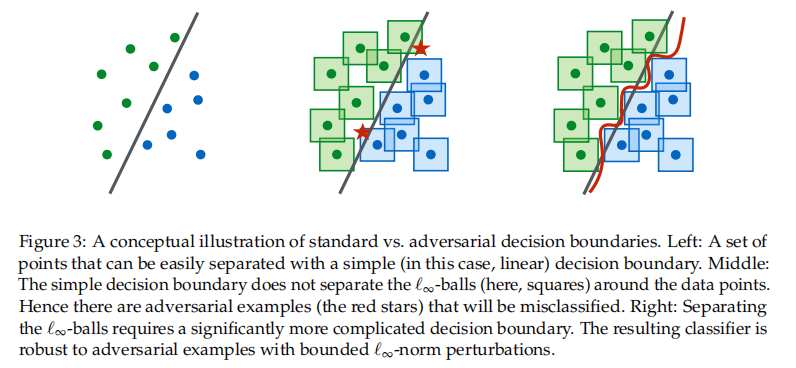 对抗鲁棒性要求分类器不仅能正确分开数据点,还要能正确覆盖每个点周围的扰动空间(对抗性样本),因此需要更复杂的决策边界以及更大容量的模型。