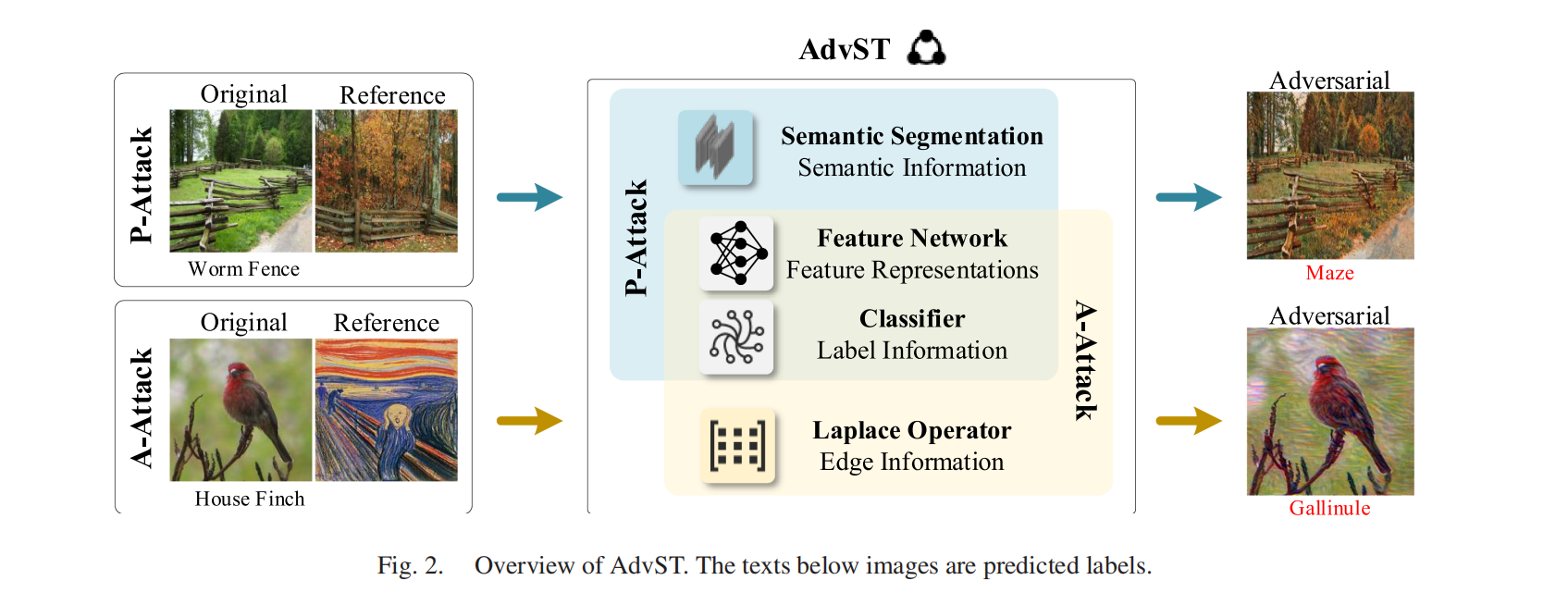 接下来,为了显著提升生成对抗图像的质量,作者根据不同的吸引性风格将参考图像划分为两类(照片与艺术作品),并进一步扩展 AdvST,设计两种相应的攻击策略。对于与原图语义内容相近但场景不同的自然照片参考图,我们设计了照片级真实感攻击(P-Attack):该方法将语义分割模型提取的语义信息与风格表征相结合,以避免颜色溢出。在这种情况下,生成的对抗图像会呈现出照片级的风格化效果,仿佛拍摄于不同场景之中,例如不同光照、不同一天中的时间(阳光强度变化)、不同天气(云层厚度变化)、不同季节以及其他自然变化。对于具有知名艺术作品风格的参考图,我们设计了艺术风格攻击(A-Attack):该方法通过引入拉普拉斯算子,在艺术风格融合与结构保持之间进行联合权衡,从而使生成的对抗图像既能保留艺术作品的细尺度特征,又能很好地保持原图内容。