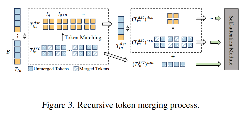 然而,上述合并过程中,dst 里的 tokens 本身并没有被进一步合并、压缩。为了最大化帧间信息融合,我们对 dst 中的 tokens 继续递归地执行类似的合并过程:在下一轮中,将上一轮中“未被合并”的 也加入到 dst 中参与匹配,直至已经不再需要进一步合并为止。此时,新一轮的匹配与合并过程与式 (7) 类似,只是参与匹配的 src/dst 和 token 数量 会随递归层数发生变化。