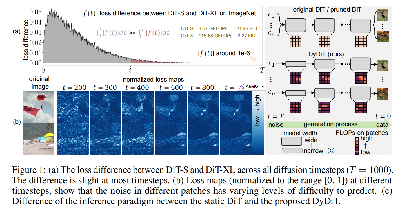 图1(a)表示在更后期的时间步,预测任务会逐渐变得更容易,即便更小的模型也能有效处理。然而,DiT 在所有时间步都使用相同架构,导致在任务复杂度较低的时间步产生过高的计算成本。